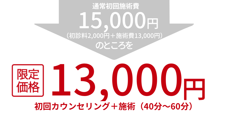 施術料金 初回:15,000円(初診料2,000円+施術費13,000円)